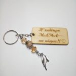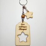 Χειροποίητο μπρελόκ με ξύλινο στοιχείο, ακρυλικές χάντρες και μεταλλικά στοιχεία.