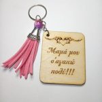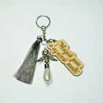 Χειροποίητο μπρελόκ με ξύλινο στοιχείο, κέρινο κορδόνι, κεραμική χάντρα και μεταλλικό στοιχείο.