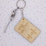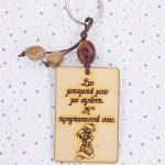 Χειροποίητο μπρελόκ με ξύλινο στοιχείο, ακρυλικές χάντρες, μεταλλικό στοιχείο, μακραμέ κορδόνι.