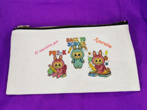 Φτιαγμένη από ανθεκτικό λινό ύφασμα και διακοσμημένη με εκτύπωση Labubu και το όνομά σου, αυτή η κασετίνα είναι τόσο όμορφη που θα τη ζηλέψουν όλοι στο γραφείο ή στο σχολείο.
