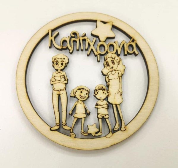 Ξύλινο στρογγυλό οικογένεια (Μπαμπάς, Μαμά, Αγόρι, Κορίτσι) και ευχές Καλή Χρονιά 10 εκ.