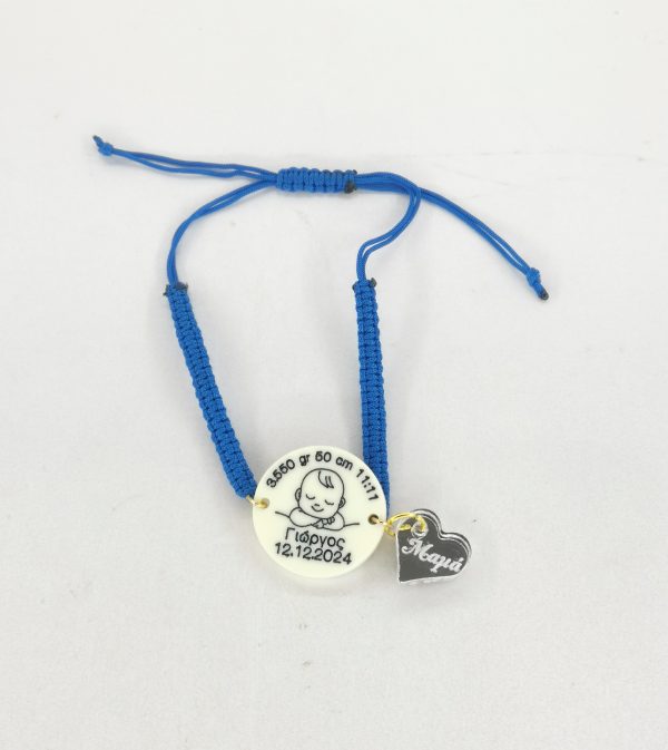 Χειροποίητο μακραμέ βραχιόλι με προσωποποιημένο στρογγυλό στοιχείο από plexiglass, χαραγμένο με τα στοιχεία γέννησης του μωρού (ημερομηνία, ώρα, βάρος, ύψος) και μία καρδούλα plexiglass με το όνομα του παιδιού ή τη λέξη “μαμά”.