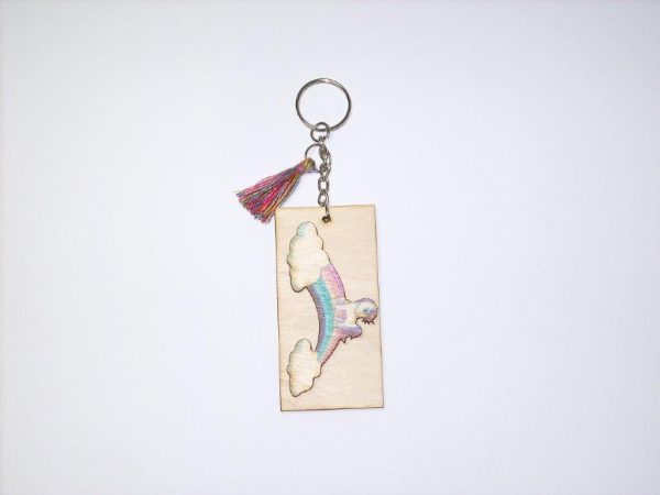 Χειροποίητο μπρελόκ με ξύλινο στοιχείο, σουέτ κορδόνι και μεταλλικά διακοσμητικά στοιχεία.