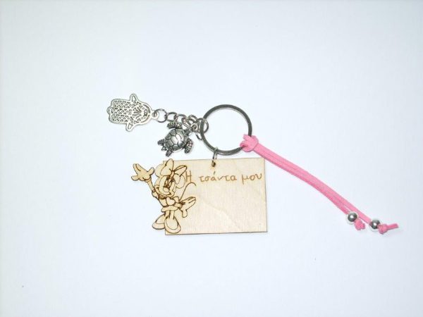 Χειροποίητο μπρελόκ με ξύλινο στοιχείο, σουέτ κορδόνι και μεταλλικά διακοσμητικά στοιχεία.