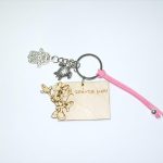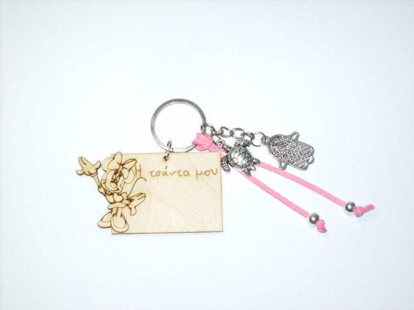 Χειροποίητο μπρελόκ με ξύλινο στοιχείο, σουέτ κορδόνι και μεταλλικά διακοσμητικά στοιχεία.