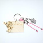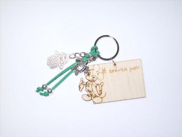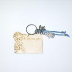 Χειροποίητο μπρελόκ με ξύλινο στοιχείο, σουέτ κορδόνι και μεταλλικά διακοσμητικά στοιχεία.