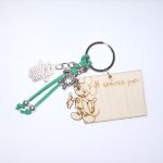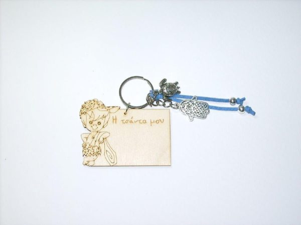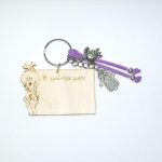Χειροποίητο μπρελόκ με ξύλινο στοιχείο, σουέτ κορδόνι και μεταλλικά διακοσμητικά στοιχεία.