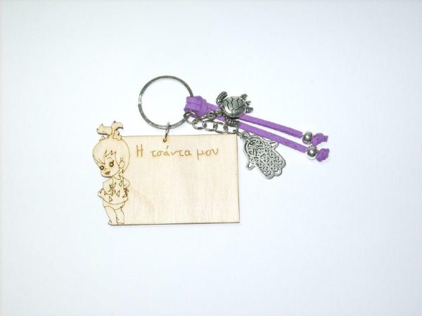 Χειροποίητο μπρελόκ με ξύλινο στοιχείο, σουέτ κορδόνι και μεταλλικά διακοσμητικά στοιχεία.