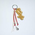 Χειροποίητο μπρελόκ με ξύλινο στοιχείο, σουέτ κορδόνι και μεταλλικά στοιχεία.