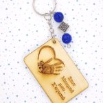 Χειροποίητο μπρελόκ με ξύλινο στοιχείο, ακρυλικές χάντρες, μεταλλικό στοιχείο, μακραμέ κορδόνι.