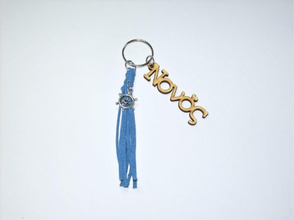 Χειροποίητο μπρελόκ με ξύλινο στοιχείο, σουέτ κορδόνι και μεταλλικά διακοσμητικά στοιχεία.