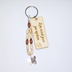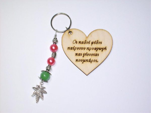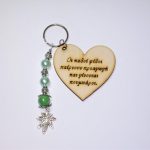 Χειροποίητο μπρελόκ με ξύλινο στοιχείο, ακρυλικές χάντρες και μεταλλικά στοιχεία.
