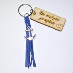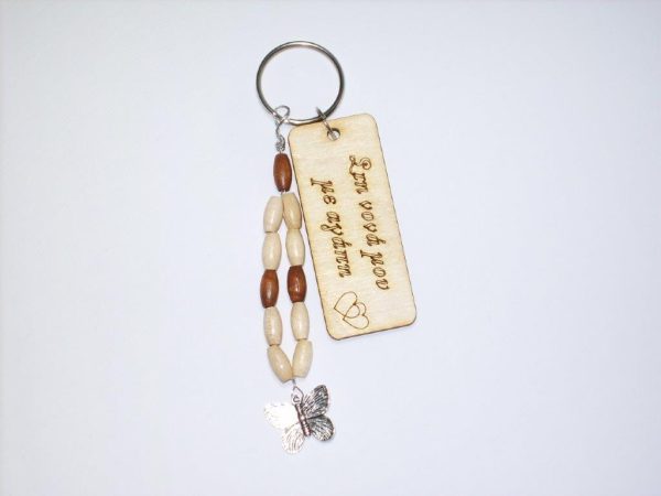 Χειροποίητο μπρελόκ με ξύλινο στοιχείο, ξύλινες χάντρες και μεταλλικά στοιχεία.