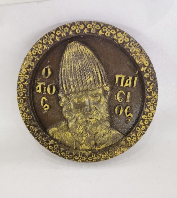 Κυκλική ανάγλυφη εικόνα με τον Άγιο Παΐσιο, σε καφέ-χρυσό φινίρισμα.