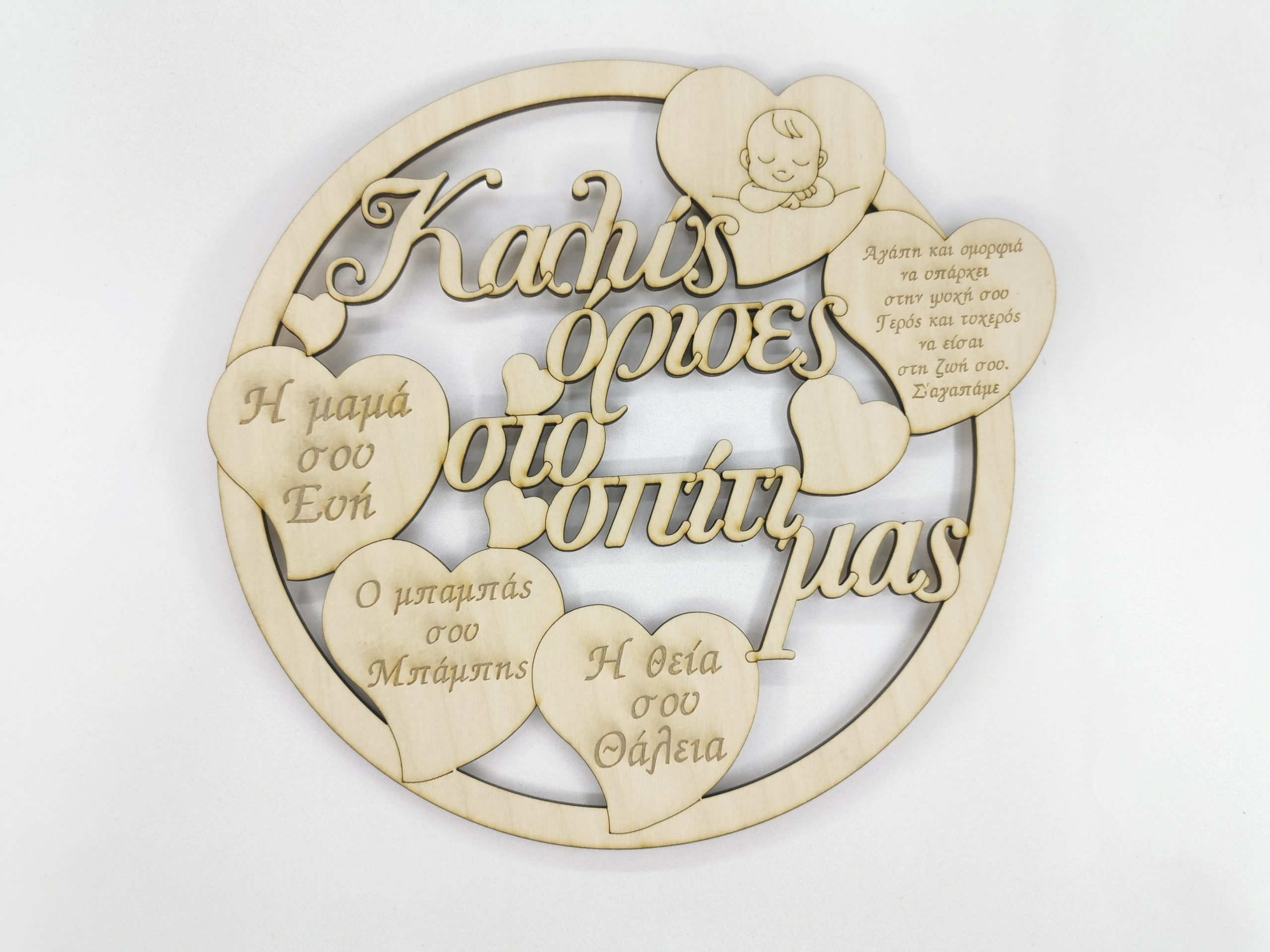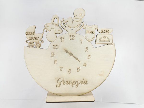 Ξύλινο αναμνηστικό γέννησης 25 εκ. στιλ ρολόι (στοιχεία επιθυμίας σας)